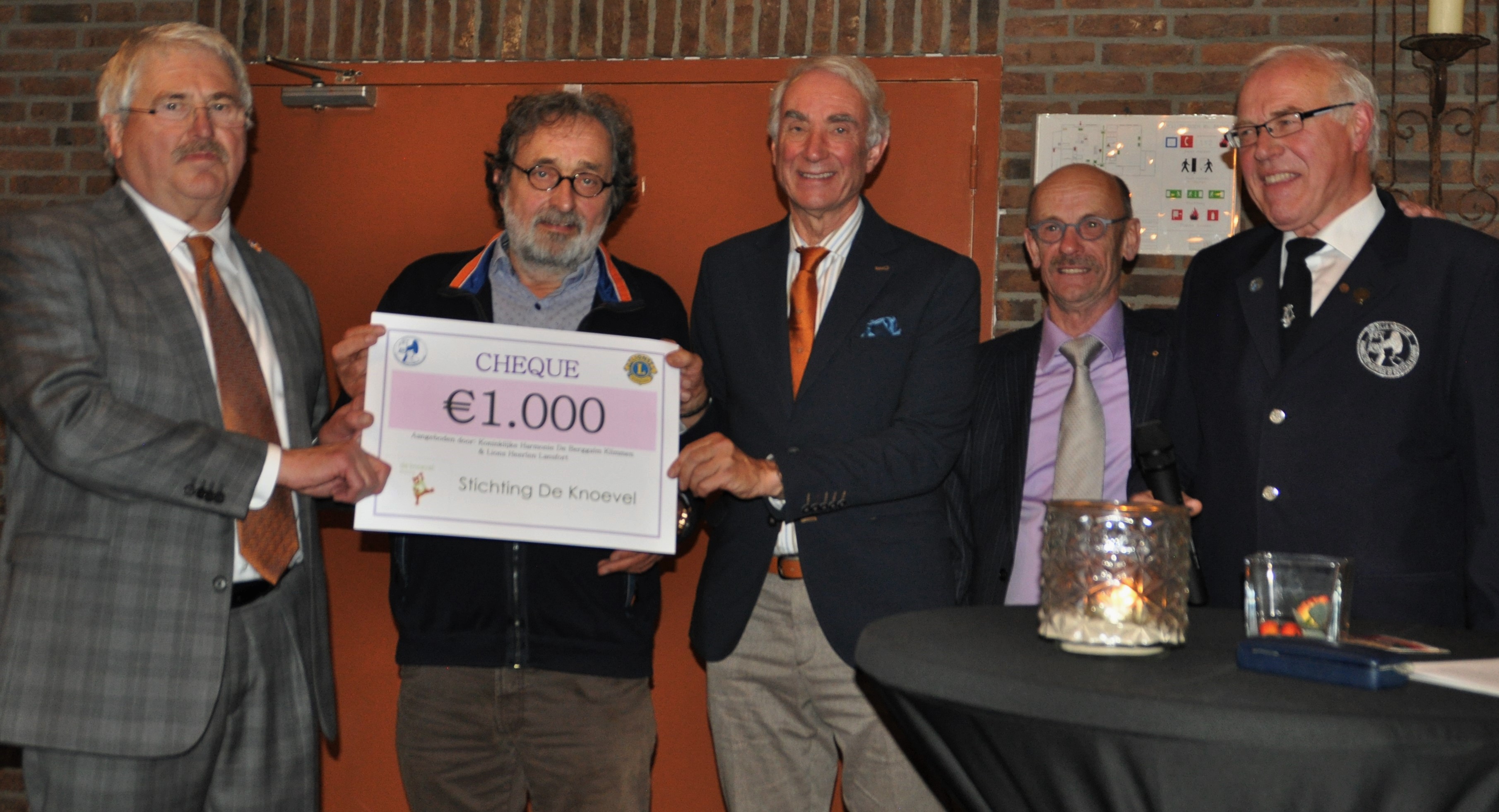 - Overhandiging cheque door Frits Beurskens (links) aan Harry Alken (2e van links) en Gerd Leers (vz Stichting Knoevel, midden)